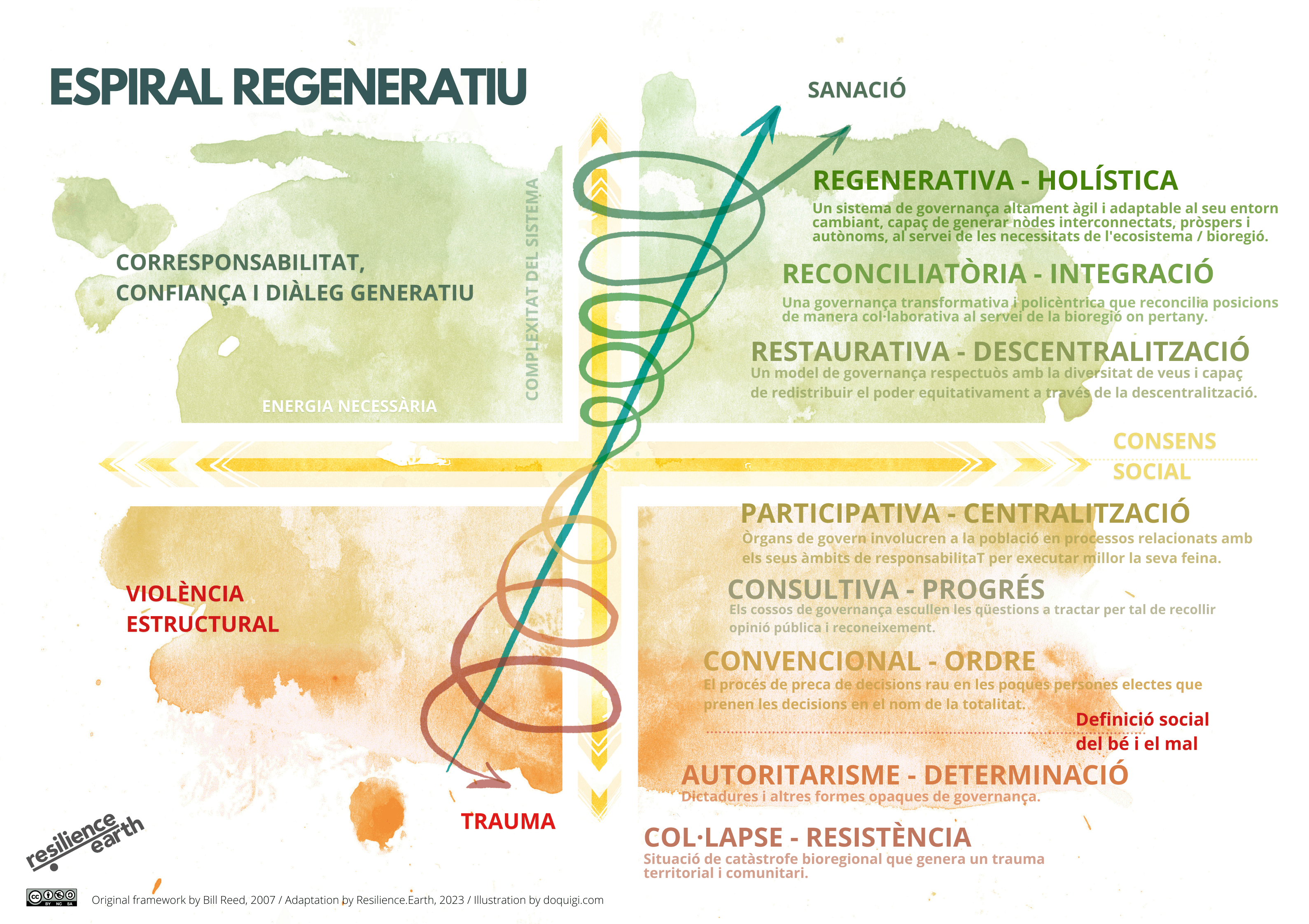 L’Espiral Regenerativa mostra com els sistemes evolucionen del trauma cap a la sanació. A la base hi ha la por, l’autoritarisme i la necessitat de control. I, a mesura que pugem l’energia del sistema, aprenem a distribuir poder i a reconèixer la interdependència.